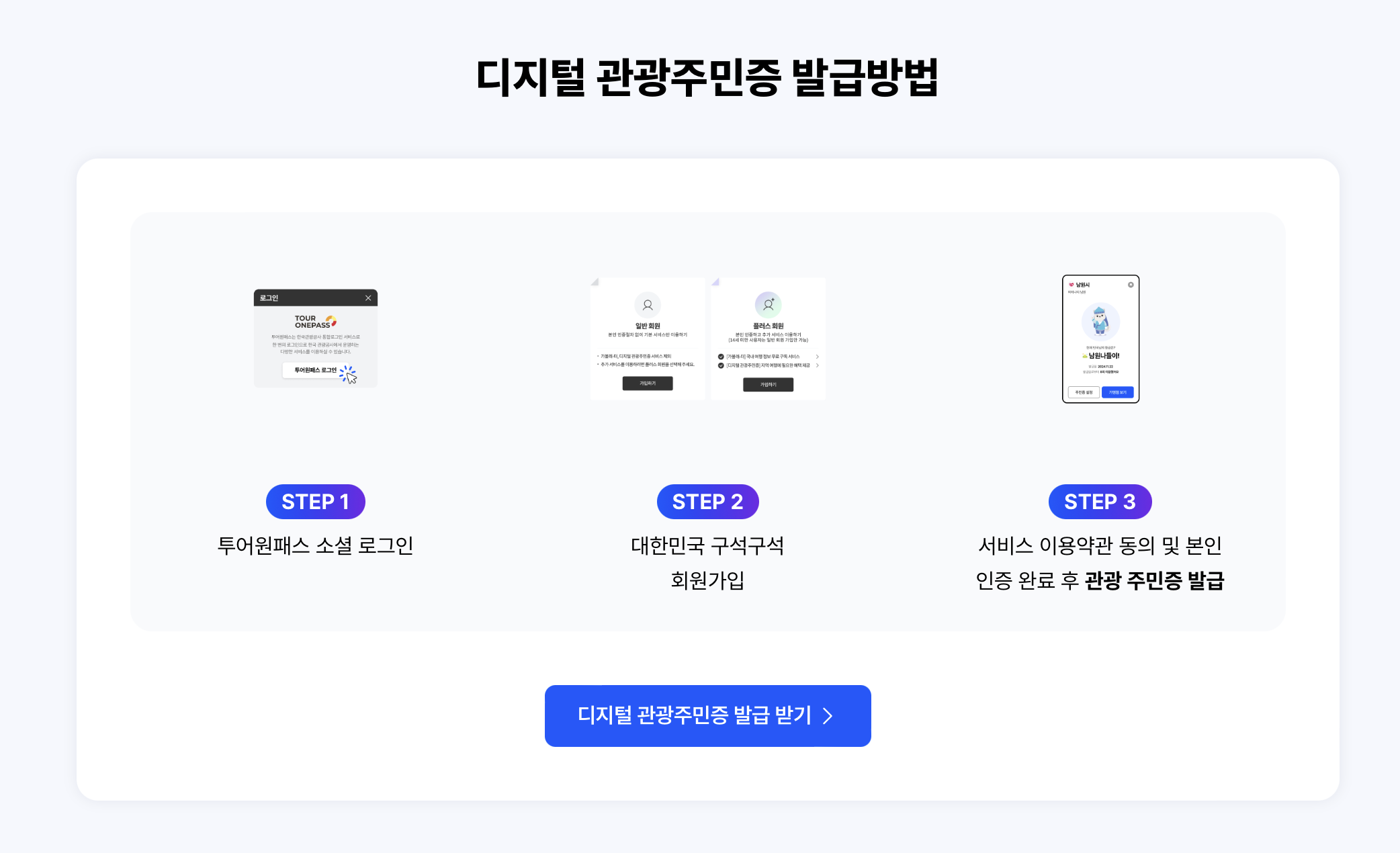 디지털 관광주민증은 앱 설치 후 간단한 인증 절차만 거치면 누구나 발급받을 수 있습니다.