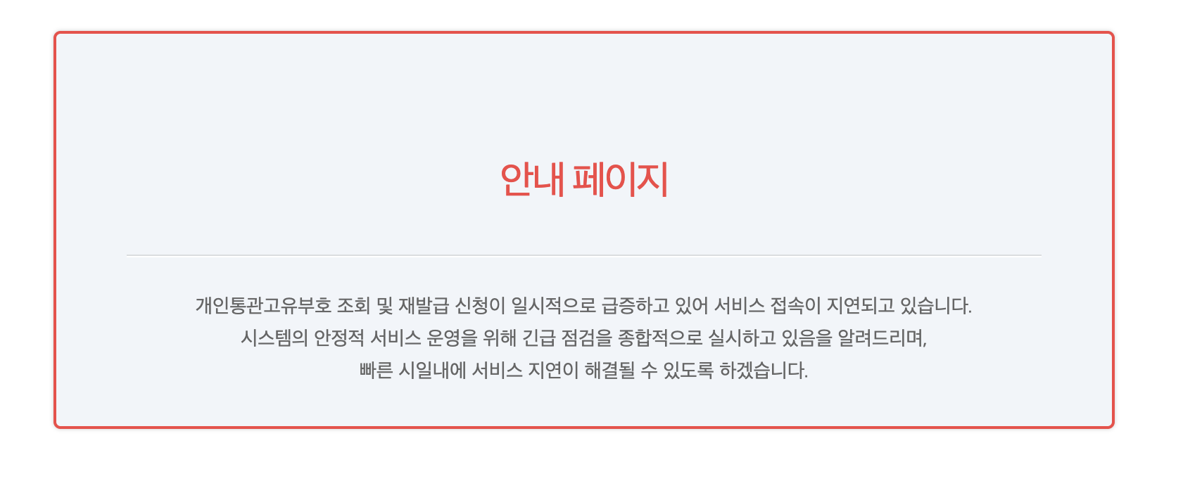 현재 쿠팡 해킹 사고로 인해 개인통관번호 재발급 서비스에 접속 지연이 되고 있습니다.